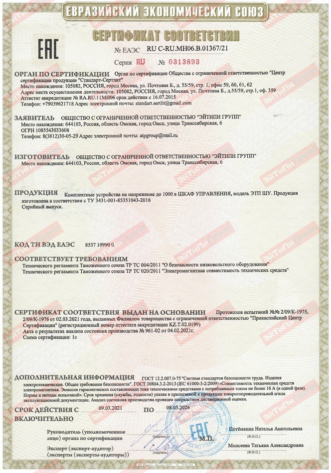Получен сертификат соответствия Евразийского Экономического Союза на комплектные устройства (шкафы управления ЭТП ШУ). Это подтверждает, что наша продукция разработана и изготовлена с применением передовых технологий и соответствует самым строгим требованиям безопасности и электромагнитной совместимости (ТР ТС 004/2011 и ТР ТС 020/2011).